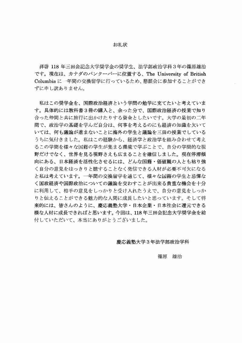 平成24年度奨学金授与証交付式に欠席した、 篠原雄治君(法学部政治学科3年)からの礼状が届いています。